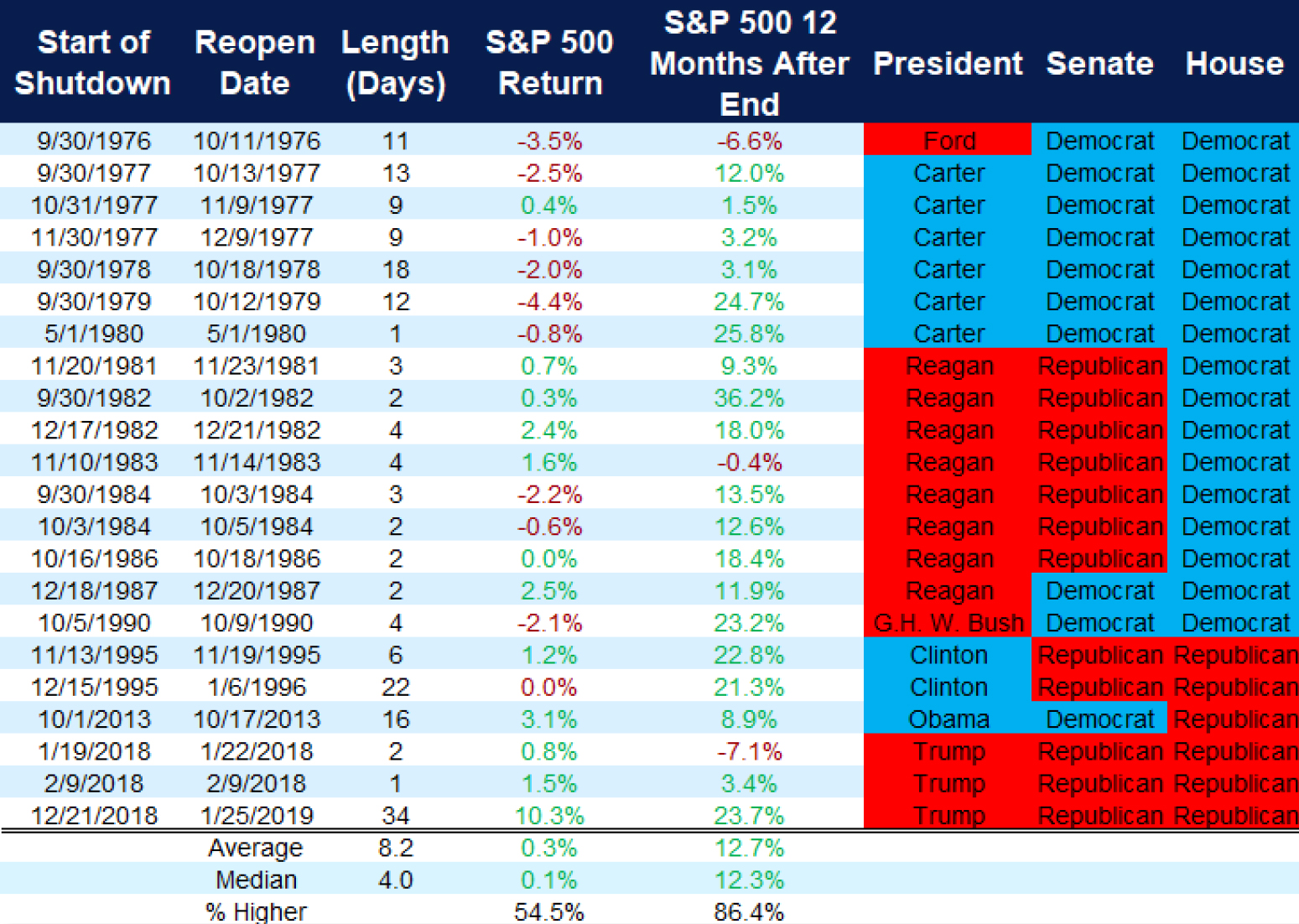 More big news came at the end of the quarter when the U.S. government shut down due to a dispute over the budget, and it remains shuttered over 2 weeks later (at the time of this writing). Historically, markets haven’t been greatly affected by government shutdowns, as the following chart illustrates. In past shutdowns, 55% of the time, the S&P 500 rose by an average of 0.3%. The average shutdown has only lasted 8 days; this one may affect markets more significantly if it continues to drag on.